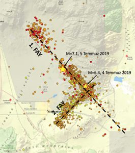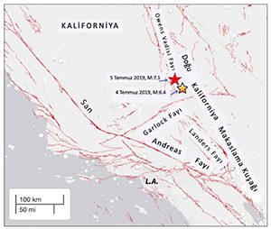 ABD Kaliforniya, Searles Vadisi, Ridgecrest bölgesinde 1 Temmuz 2019’da başlayan küçük deprem etkinliğinin ardından 4 Temmuz 2019’da yerel saatle 10:33’de 6.4 büyüklüğünde bir deprem meydana geldi (Şekil 1). Ridgecrest bölgesi deprem bakımından çok aktif olmamakla birlikte son 30 yılda orta kuvvette depremler olan bir bölgeydi. Depremin bulunduğu ve fazla yerleşim olmayan bu bölge tektonik olarak Doğu Kaliforniya Makaslama Bölgesi olarak anılır. Depremin olduğu alanda KKB-GGD doğrultulu iki fay kuşağı vardır. Kuzeydeki Owens Fayı, güneydeki ise üzerinde birçok ardışık tetiklemeli depremlere sahne olmuş Landers Fay kuşağıdır (Şekil 1). Owens Fayı üzerinde 26 Mart 1872’de 7.6 büyüklüğünde, Landers Fayı üzerinde ise 29 Haziran 1992’de 7.3 büyüklüğünde deprem olduğunu biliyoruz. Bölgede ayrıca KKD-GGB doğrultusunda yerleşen ve Landers Fayı’nı kesen Garlock Fayı vardır. İşte 4 Temmuz 2019’da 6.4 büyüklüğündeki bu son deprem bu iki fay kuşağının birbirini kestiği kavşakta ortaya çıkmıştır (Şekil 1 ve Şekil 2).