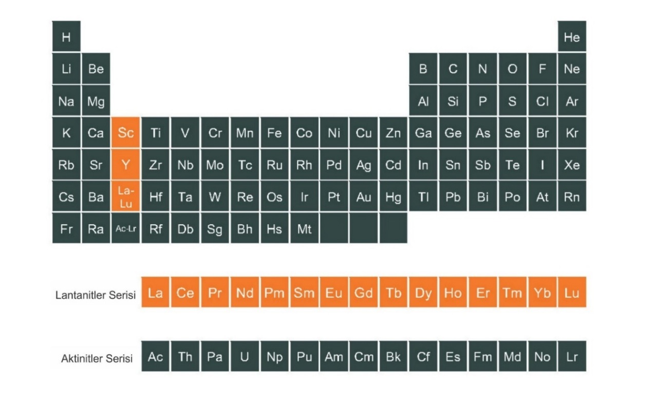 Nadir Toprak Elementleri (NTE) kimyasal tabloda atom numaraları 57 ile 71 arasında değişen 15 adet element (lantanitler serisi: lanthanum (La), seryum (Ce), praseodimiyum (Pr), neodimiyum (Nd), prometyum (Pm), samarium (Sm), evropiyum (Eu), gadolinium (Gd), terbiyum (Tb), disprosyum (Dy), holmiyum (Ho), erbiyum (Er), tulyum (Tm), iterbiyum (Yb) ve lutesyum (Lu)) olarak yer almaktadır. Ayrıca, Uluslararası Saf ve Uygulamalı Kimya Birliği (IUPAC) tarafından skandiyum (21) ve itriyum (39) da benzer kimyasal özellikleri nedeniyle bu element grubuna dahil edilmiştir (Şekil 1). Bu elementler tipik olarak elektron konfigürasyonu ve atomik ağırlıkları nedeniyle hafif nadir toprak elementleri (HNTE, La, Ce, Pr, Nd, Sm, Eu) ve ağır nadir toprak elementleri (ANTE, Gd, Tb, Dy, Ho, Er, Tm, Yb, Lu) gruplarına ayrılmaktadır. Ayrıca bazı çalışmalarda ise Sm, Eu ve Gd orta nadir toprak elementleri (ONTE) olarak sınıflandırılmaktadır.