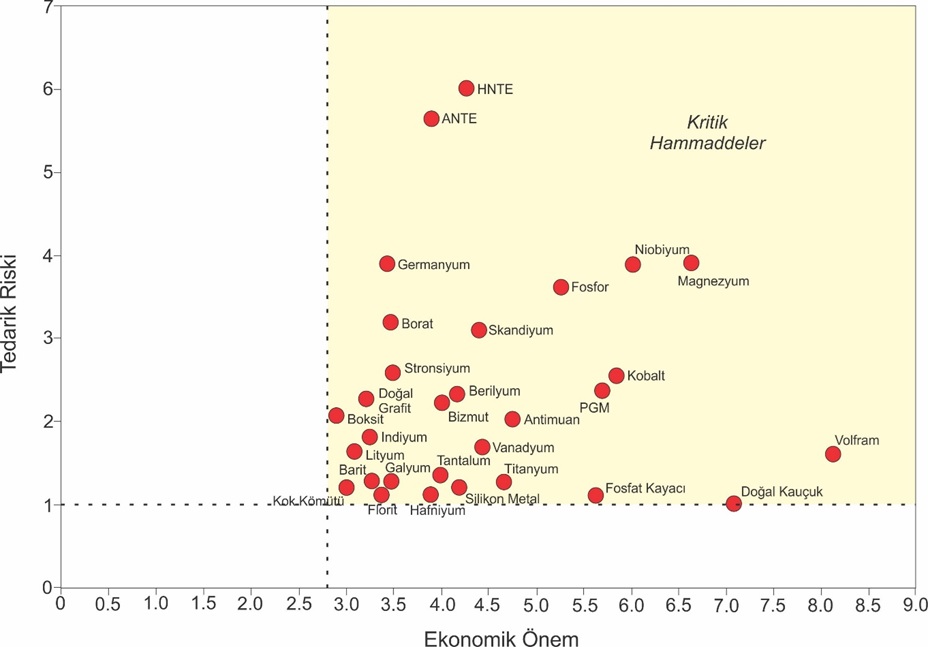 NTE’lerin nadir olarak isimlendirilmelerinin esas nedeni ise yer kabuğunda bulunan düşük konsantrasyonlarından ziyade zenginleştirme ve saflaştırma işlemlerinde karşılaşılan zorluklar nedeniyledir. Yapay olarak üretilen ve radyoaktif bir element olan Pm haricinde diğer NTE’lerin doğal olarak yer kabuğunda bulunma oranlar 0.3 ppm ile 63 ppm arasında değişmekte ve yüksek ergime sıcaklıkları (798oC-1663oC) dikkat çekmektedir (EuRare, 2018). Günümüzde ileri teknolojinin vazgeçilemez bileşenleri olan NTE’ler nispeten yüksek ekonomik değeri ve çok daha önemlisi yüksek tedarik riski nedeniyle stratejik bir hammadde kaynağı pozisyonundadır. Şekil 2’de Avrupa Komisyonu tarafından 3’er yıllık periyotlar halinde ve sonuncusu 2023 yılı içerisinde Kritik Hammaddeler Raporu’nda NTE’lerin daha önceki raporlarda olduğu gibi en fazla tedarik riski olan kritik hammaddeler sınıfında yer aldığı görülmektedir.