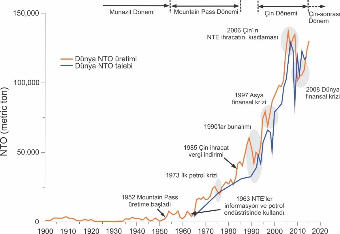 Yüksek teknolojinin kritik hammadde kaynağı pozisyonunda bulunan NTE’lere olan talep yaklaşık son 57 yıl süresince hızlı bir şekilde artış göstermektedir (Şekil 3). NTE’ler ilk olarak 1963 yılında enformasyon ve petrol endüstrisinde kullanılmıştır. Bu tarihten itibaren 1990’larda meydana gelen ekonomik bunalımı, 1997 Asya finansal krizi ve 2008 dünya finansal krizi dışında yüksek teknoloji ve endüstriyel uygulamalarının günlük hayatımızda yaygınlaşması ile doğru orantılı olarak düzenli bir artış göstermiştir. 1985 yılına kadar NTE üretiminde hâkim ülke pozisyonunda ABD bulunuyorken bu tarih sonrasında Çin’in NTE endüstrisine yaptığı yatırımlar ve ihracatında uyguladığı indirimler ile üretim ve pazar hakimiyeti Çin’in kontrolüne geçmiştir. Özellikle 2006 ve 2010 yıllarında Çin tarafından uygulanan ihracat sınırlaması ile NTE’lere olan talep uluslararası piyasada ciddi derecede artış göstermiştir (Zhou vd. 2017).