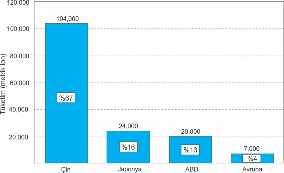 Şekil 4’de sunulan 2016 yılına ait global ölçekte NTE tüketim verilerine dikkatle bakıldığında Çin tüketim oranlarında da %67’lik payı ile ciddi bir fark ile ön sırada yer almaktadır. Çin’i daha düşük oranlarda diğer teknoloji üreten ülkeler olan Japonya (%16), ABD (%13) ve Avrupa ülkeleri (%4) takip etmektedir. Buradan çıkarılması gerekilen en önemli sonuç ise Çin’in sadece hammadde üretim pazarına hakimiyeti değil aynı zamanda hammaddeyi ilgili stratejik sektörlerde kullanarak yüksek katma değere dönüştürmesidir. Çin’in ekonomik olarak asıl geliri bu şekilde sağladığı düşünülmekte ve kendi kullanımı dışında gerçekleştirdiği hammadde arzını da gerek diğer oyuncuların piyasaya girmesini engellemekte gerekse uluslararası politik bir güç olarak kullanmak amacıyla gerçekleştirdiği şeklinde yorumlanabilir.