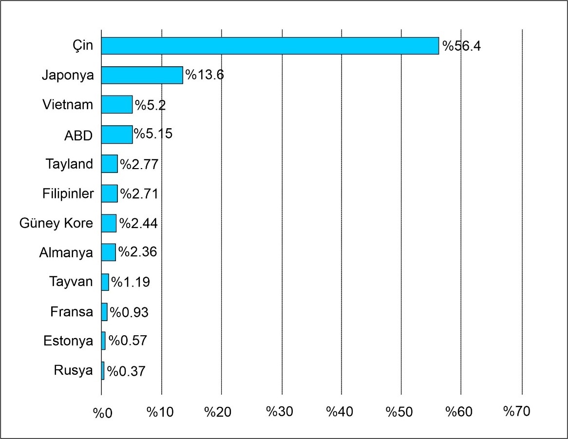 Şekil 5’te ise 2023 yılına ait ithalat payları görülmektedir. 2016 yılına benzer şekilde NTE’lerin yine en yüksek miktarda sırasıyla Çin, Japonya ve ABD tarafından kullanıldığını görülmektedir. Önemli bir farklılık olarak Vietnam, Tayland, Filipinler ve Güney Kore’nin önemli sayılabilecek oranlarda NTE ithalatı yaptığı belirlenmiştir. Teknoloji üreten ülkelerin NTE’lerin ana ithalatçısı ve tüketicisi olduğu görülmektedir.