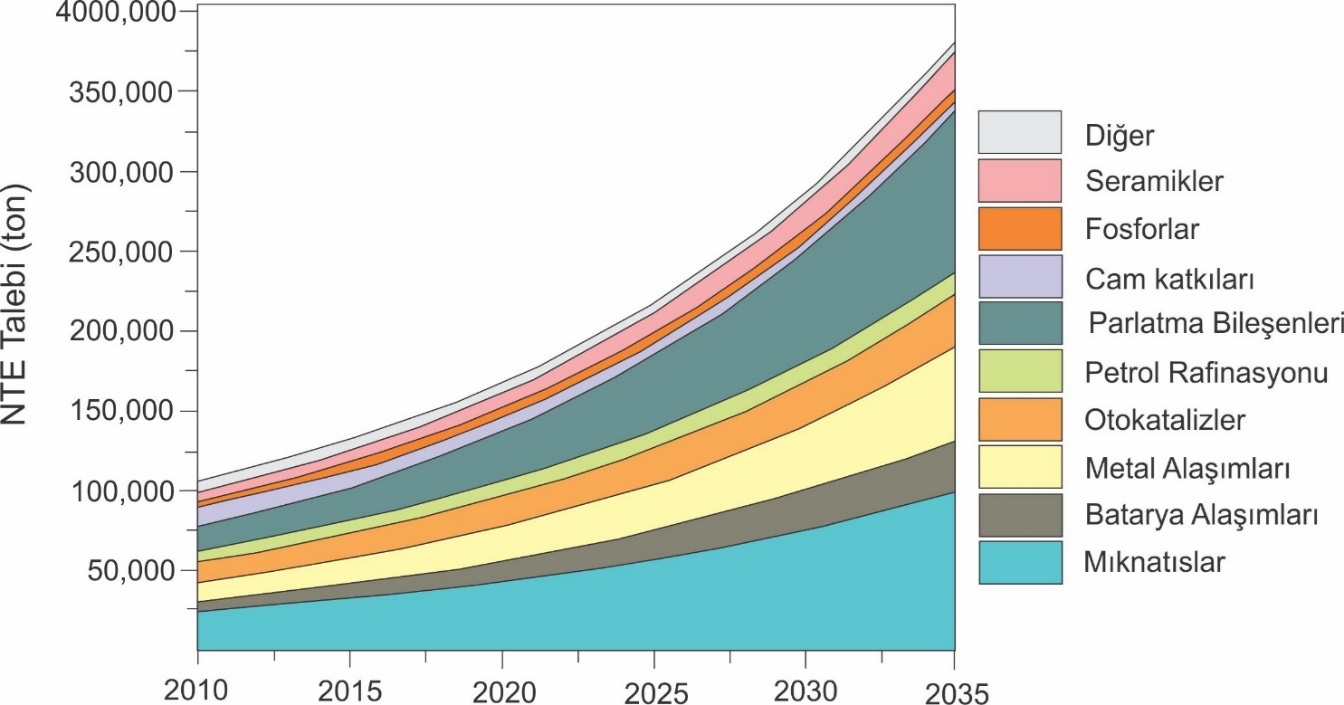 NTE’lerin mıknatıslar, batarya alaşımları, metal alaşımları, oto katalizörler, petrol rafinasyonu, parlatma bileşenleri, cam katkıları, fosforlar ve seramikler gibi yüksek ticaret hacimlerine sahip sektörlerdeki kullanım oranlarının 2035 yılına kadar doğrusal olarak artış göstereceği ve buna bağımlı olarak da talebin sürekli oranda artacağı düşünülmektedir (Şekil 6). Örneğin 2012 yılında yapılan bu projeksiyon geçtiğimiz yıllarda gerçekleşen reel talep miktarları ile uyumlu seyretmiştir. Buna göre toplam NTE talebinin 2035 yılına kadar 400.000 ton seviyelerine yaklaşacağı öngörülmektedir. Bu artan talep içerisinde ise en yüksek ihtiyaç miktarlarının mıknatıs ve parlatma bileşenleri sektörlerinde olacağı düşünülmektedir (Şekil 6).