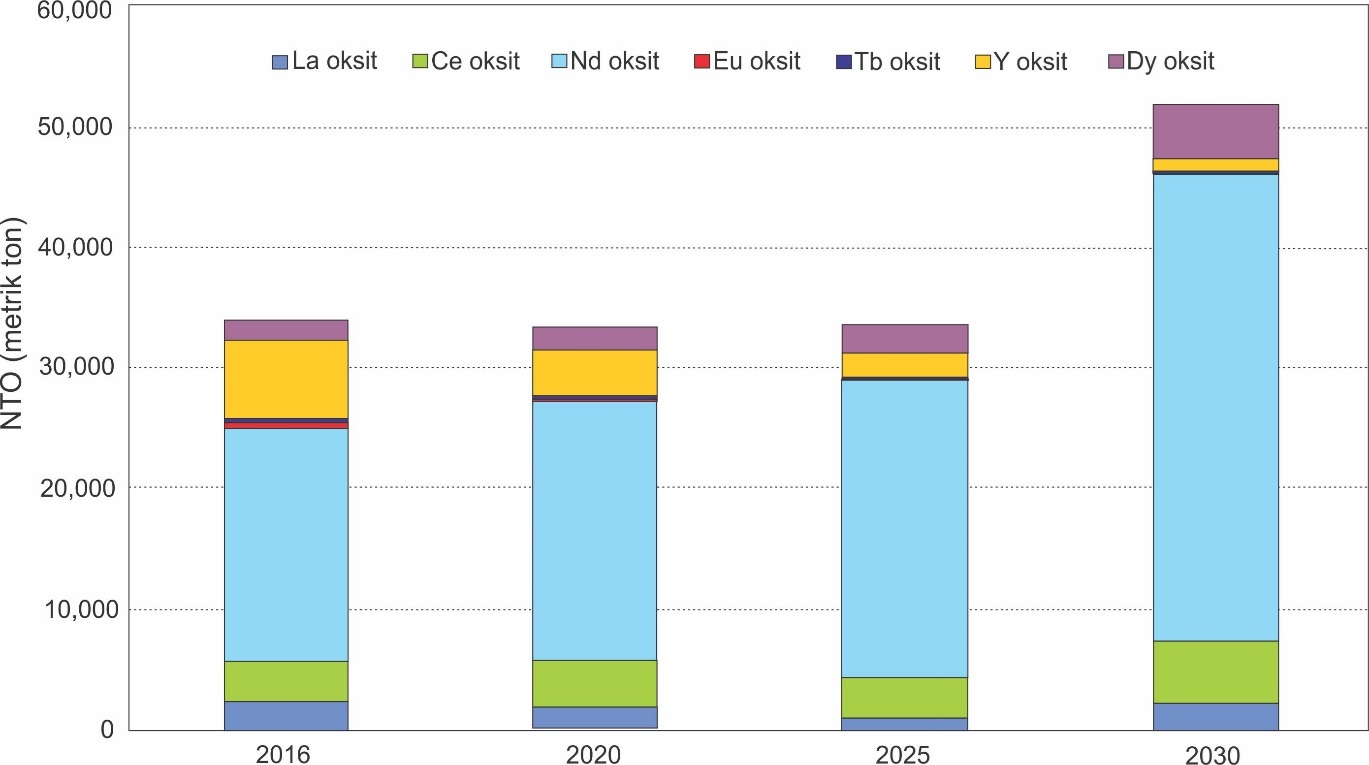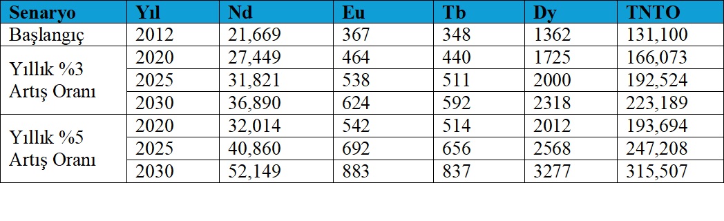 2017 yılında yapılan bir projeksiyon çalışmasına göre NTE’lerin yüksek teknolojide artan kullanım miktarları ve buna dayalı oluşturulan tahmini artış oranları dikkate alındığında önemli katma değerli ürünlerin bileşenleri olan Nd, Eu, Tb, Dy ve toplam NTE oksit üretim miktarlarında ile 2025 ve 2030 yıllarında da ciddi artışlar söz konusu olacağı tahmin edilmiştir (Tablo 2). 2025 yılı itibari ile geldiğimiz noktada yapılan projeksiyondan çok daha fazla oranda bir üretim artışı gerçekleşmiştir ve hatta 2030 yılındaki projeksiyon rakamlarını dahi geçmiştir (Tablo 1).
