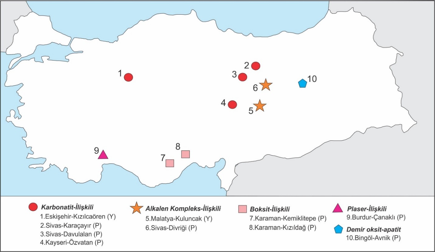 Şekil 8’de gösterildiği gibi ülkemiz sınırları içerisinde önemli düzeyde sayılabilecek NTE yatakları ve cevherleşme potansiyeline sahip bölgeler bulunmaktadır. Bunlar ile ilgili bilgiler aşağıda sırasıyla sunulmuştur.
