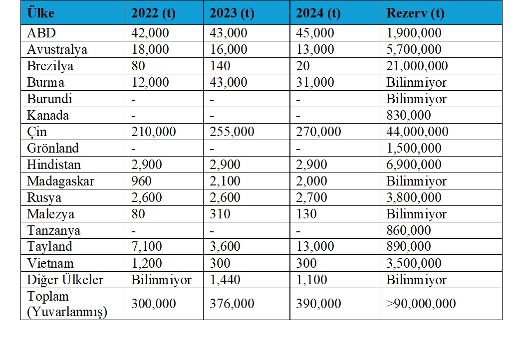 Tablo 1’de ise 2022, 2023 ve 2024 yıllarına ait global ölçekte ülkelerin yaptığı üretim ve sahip oldukları rezerv miktarları sunulmuştur. Burada açık şekilde görüldüğü üzere bahsi geçen yıllarda Çin’in gerek rezerv miktarı gerekse üretim oranları noktasında açık ara liderliği devam etmektedir. 2017 yılında uluslararası pazarda Çin’in NTE üretimi dünya genelindeki toplam NTE üretiminin %79 oranında iken 2018 ve 2019 yıllarında bu oran sırasıyla %63 ve %62 şeklinde gerçekleşmiştir (USGS, 2020). Bu düşüşteki temel nedenler NTE rezervlerine sahip diğer ülkelerin de uluslararası pazara girme ve kendi ulusal NTE tedarik zincirlerini kurma çalışmaları olarak gösterilebilir. Özellikle ABD’de 2018 ve 2019 yıllarında sırasıyla 18.000 ve 29.000 t NTE üretimi gerçekleşmiştir. Bu rakam Tablo 1’de görüldüğü gibi 2022-2024 yılları arası ortalama 43.000 t seviyelerine gelmiştir. Esasında ABD bu üretimi Mountain Pass bölgesinden konsantre cevher olarak gerçekleştirmiş ve saflaştırma prosesleri için Çin’e göndermek durumunda kalmıştır. Yine az miktarda da olsa Hindistan 2017 yılına kıyasla 2018 ve 2019 yıllarında üretimini yaklaşık %50’nin üzerinde artırmıştır. 2024 yılında ise benzer seviyede devam etmektedir. Yine son yıllarda Madagaskar’da üretim yapılmaya başlanmıştır. Yine Tablo 1’de görüldüğü üzere Kanada, Grönland ve Tanzanya gibi ülke ve bölgelerde ciddi NTE rezervleri bulunmasına rağmen henüz NTE üretimi gerçekleşmemiştir.
