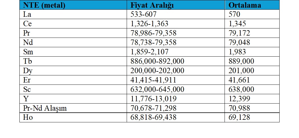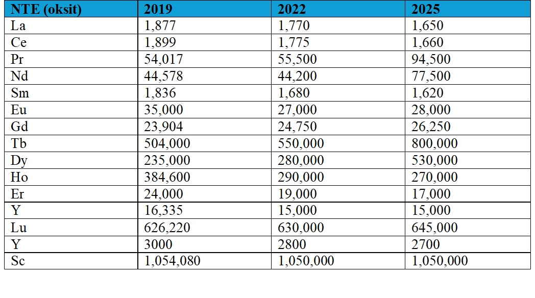 Tablo 3’de NTE oksit fiyatlarının 2019 yılındaki durumları ve 2022 ile 2025 yıllarında bu fiyatların ulaşması düşünülen rakamlar sunulmuştur. Burada görüldüğü gibi kullanım alanlarının darlığı ile ilişkili arz fazlası ve jeolojik kaynaklar ile elektronik atıklardan geri dönüşüm ile nispeten daha kolay temininin gerçekleştirilebildiği bazı NTE’lerin (örn. La, Ce, Eu, Y) fiyatlarında düşüş beklenirken buna karşın bazı NTE’lerde (Nd, Pr, Dy, Tb) ise gelişen teknolojilerle ilişkili arz yetersizliği ve zor teminine bağlı olarak fiyat artışları öngörülmüştür.